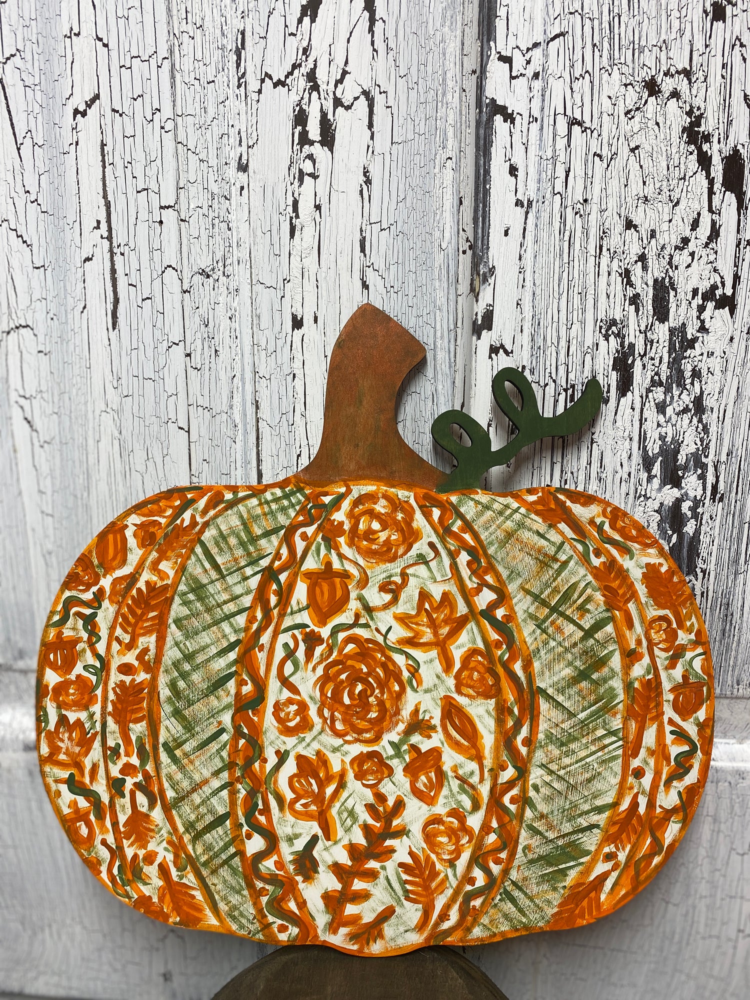 Bring on fall with this Chinoiserie-inspired Fall pumpkin front door wreath. Hints of fall leaves and acorns are sprinkled among fun laurels, swirls and a few florals. Like the design and want a different color scheme? Just message us and we can accomodate most any request. The one in the listing photos is approx 18"W x 17.5"H please let us know if you would like a different size we are happy to try and accommodate. Choose the painted version or the DIY Blank version and we will get it on the way from our pumpkin patch to yours.