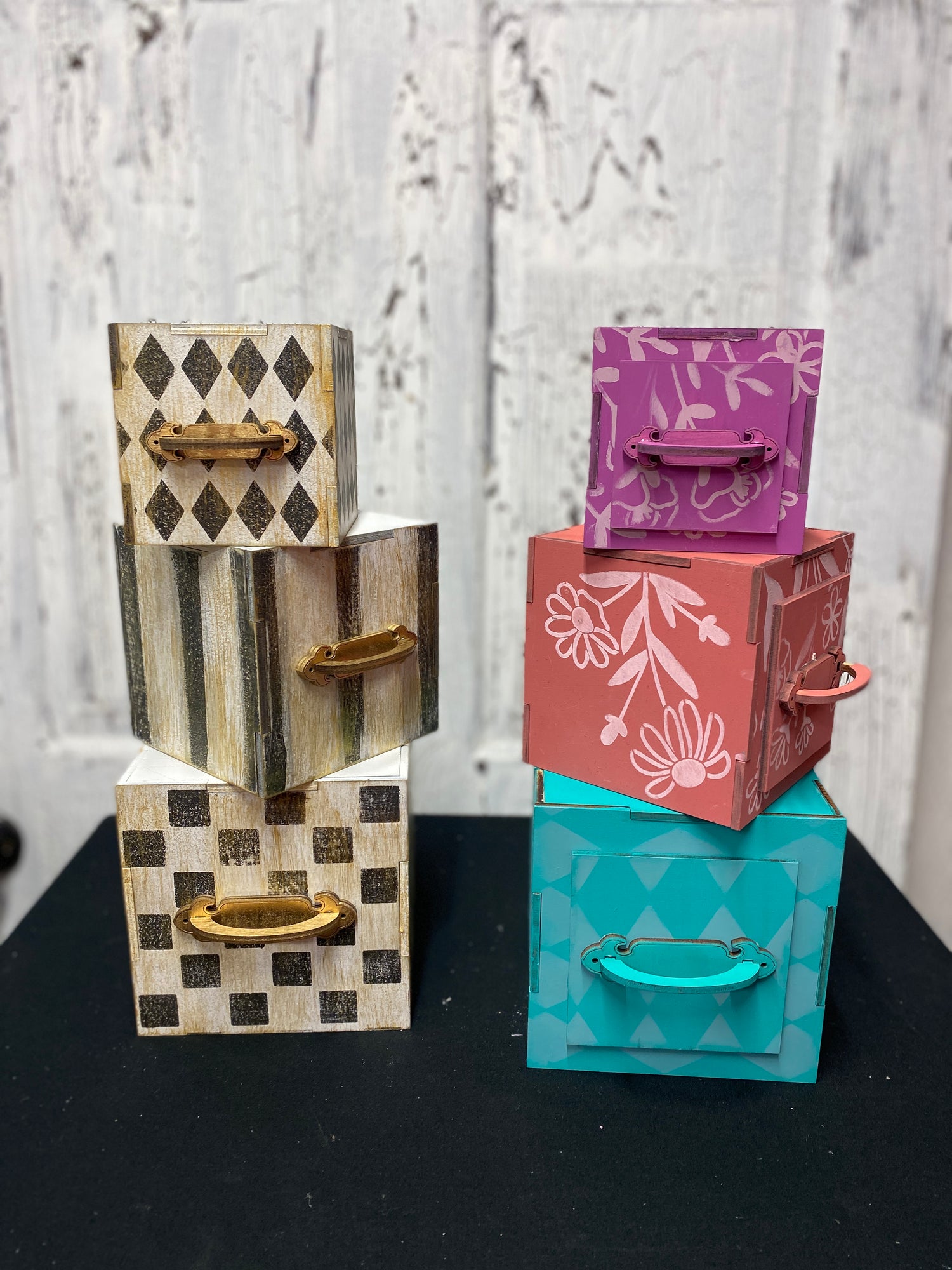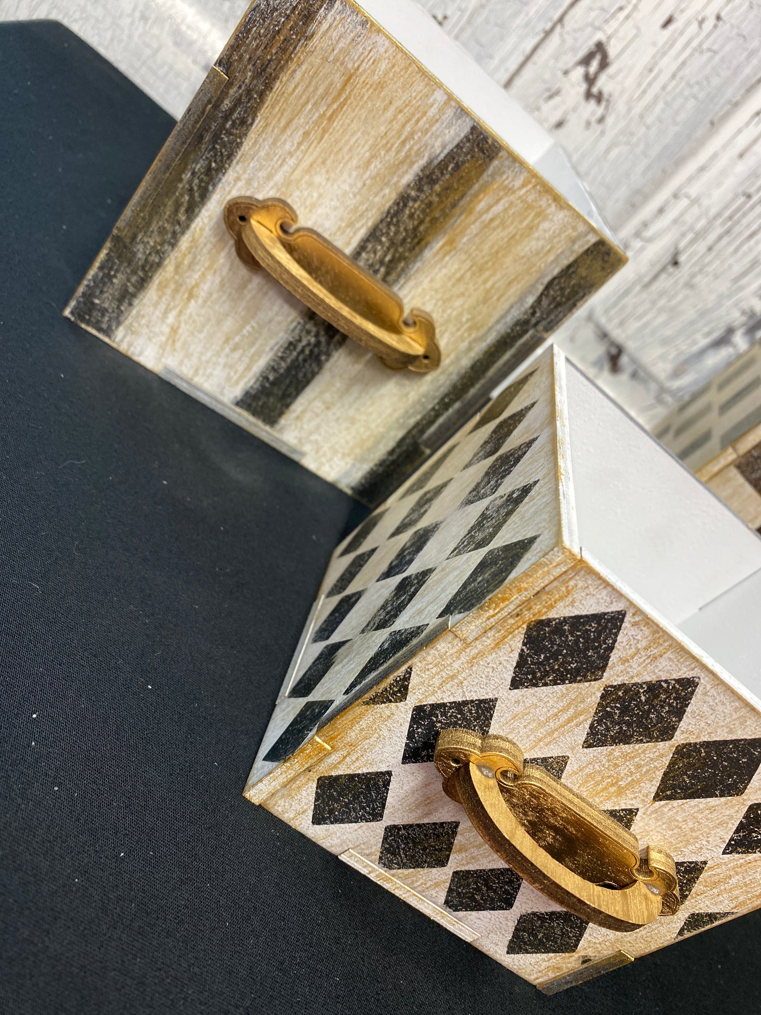 Bring rustic or bohemian farmhouse charm and versatile function to your home with this set of 3 wooden nesting planter boxes. Cottagecore storage at its finest! Each box features a unique decorative pattern and faux handles, making them perfect for both practical storage and stylish display. Have a different color theme or design in mind? Message us and we will be happy to try and accomodate most any request. Black and white set has harlequin, striped and check pattern with gold metallic distressing to top it off or choose the multi color set with gorgeous floral and harlequin designs. Are you a DIYer? Choose the blank ones and add your own personal touch.