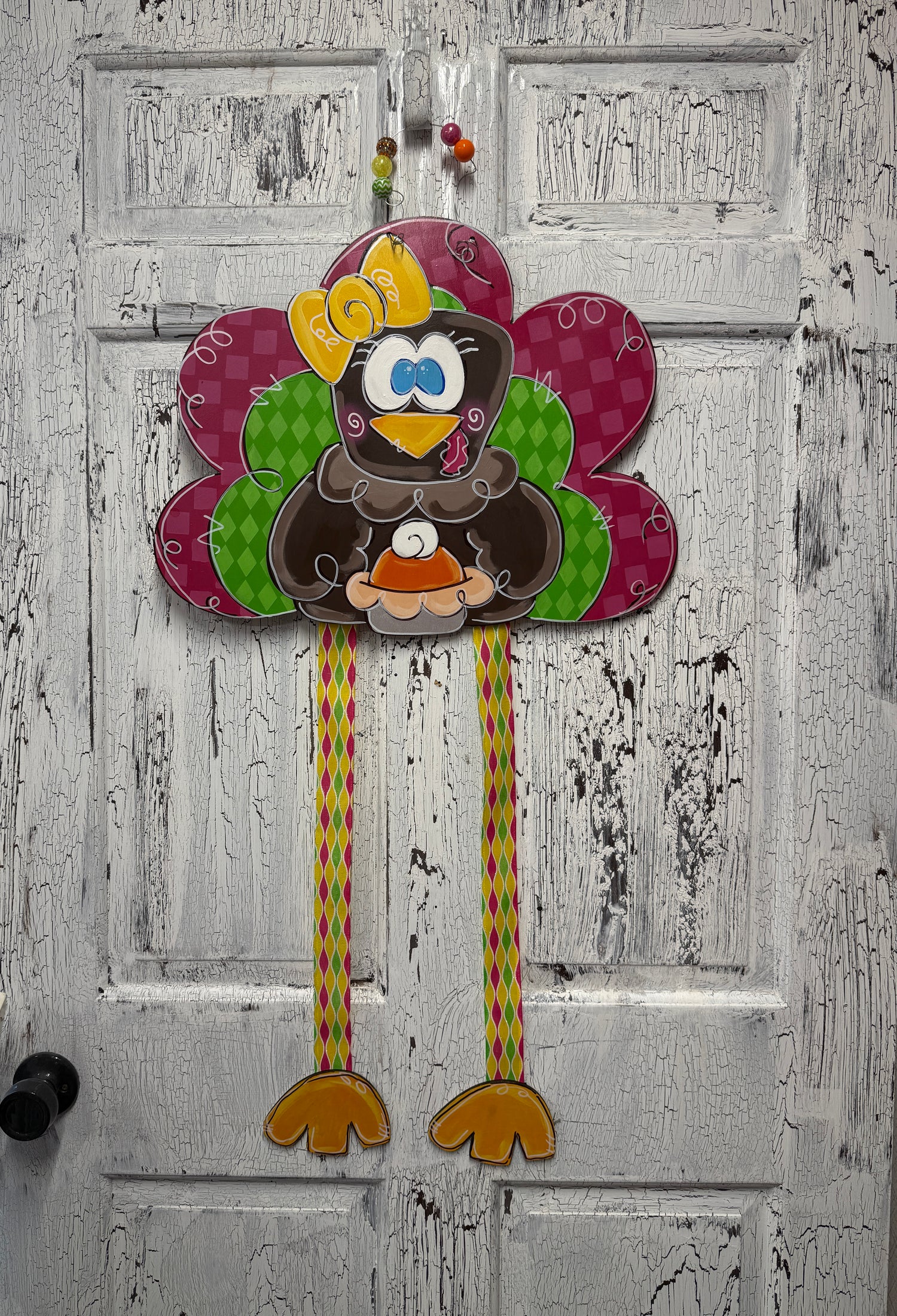 Whimsical Hand Painted Turkey Door Hanger with Ribbon Legs – Thanksgiving Door Decor