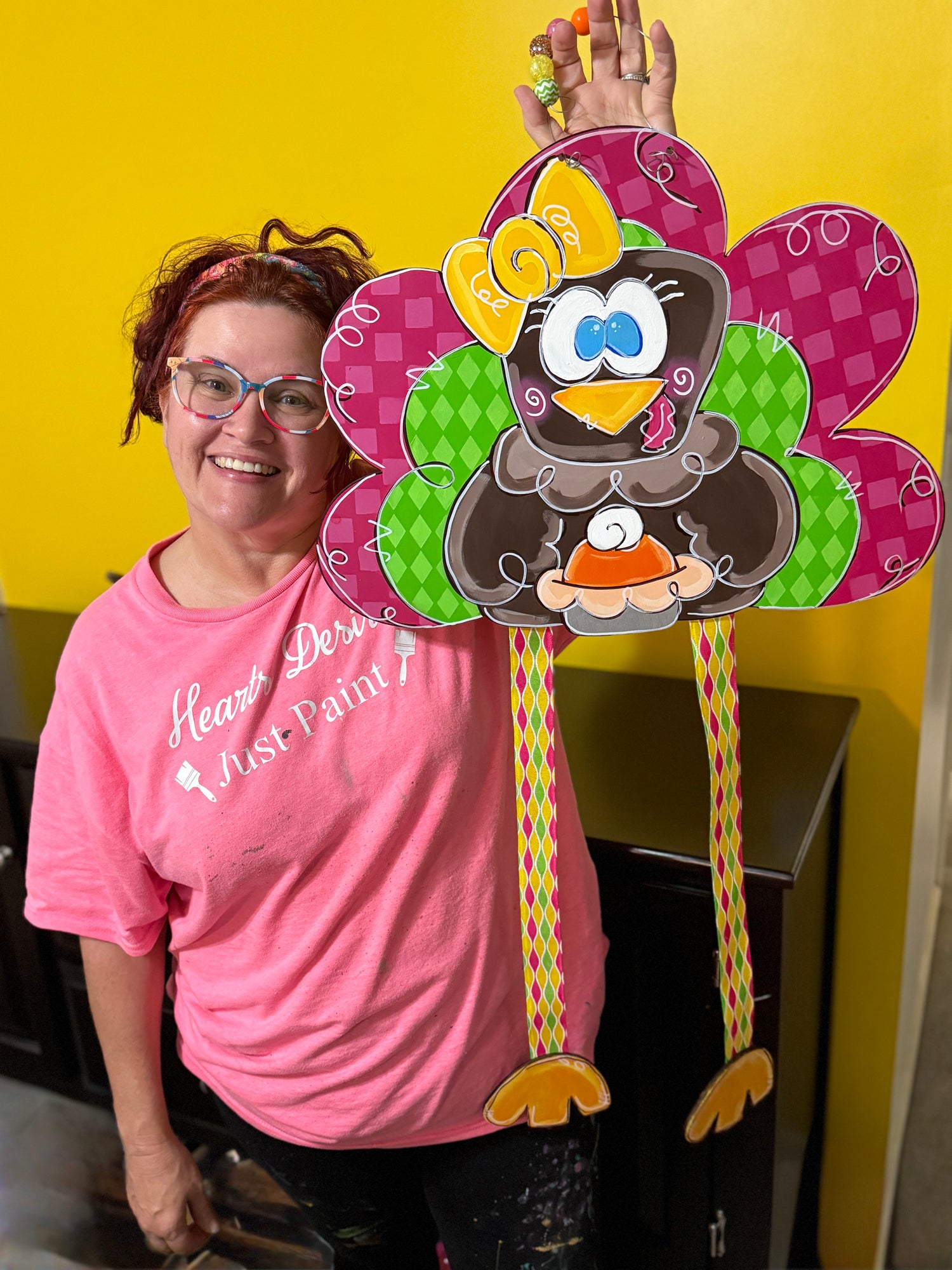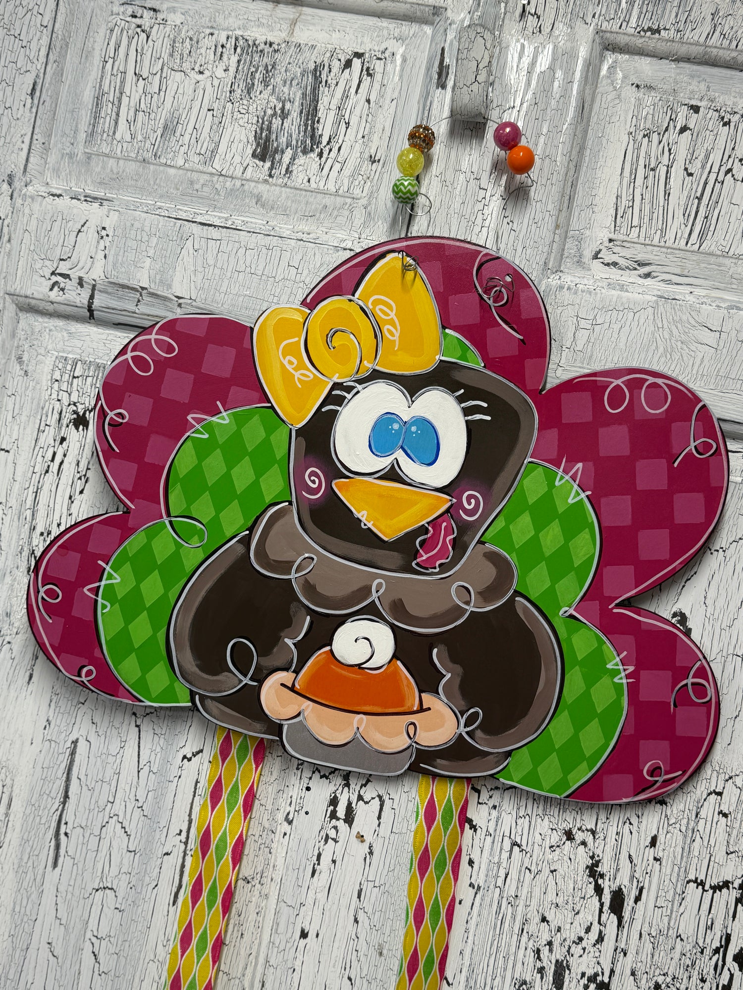 Add a playful pop of fall cheer to your front door with this whimsical hand-painted turkey door hanger! This colorful and fun design features a bright-eyed turkey holding a slice of pumpkin pie, complete with patterned ribbon legs.