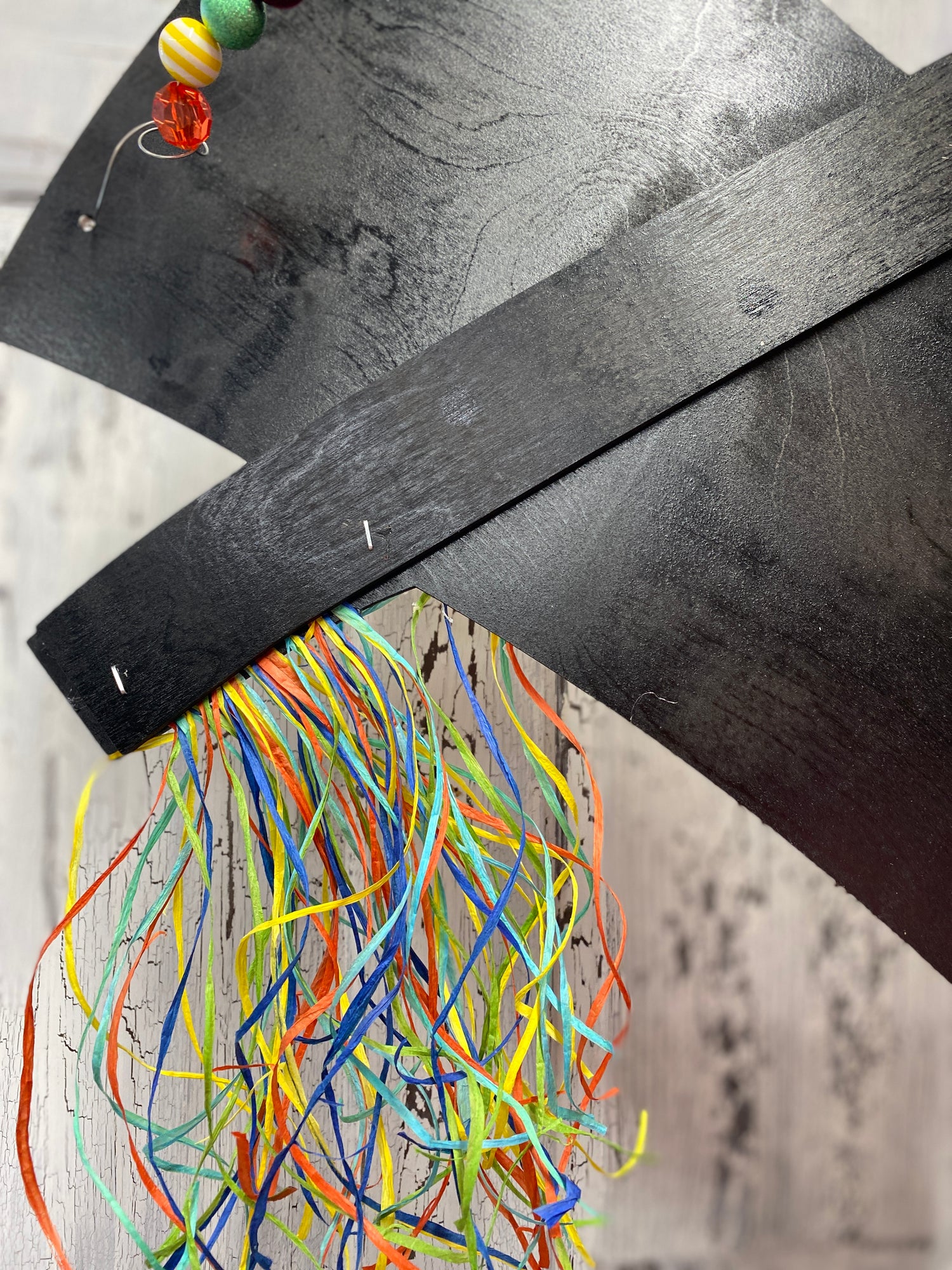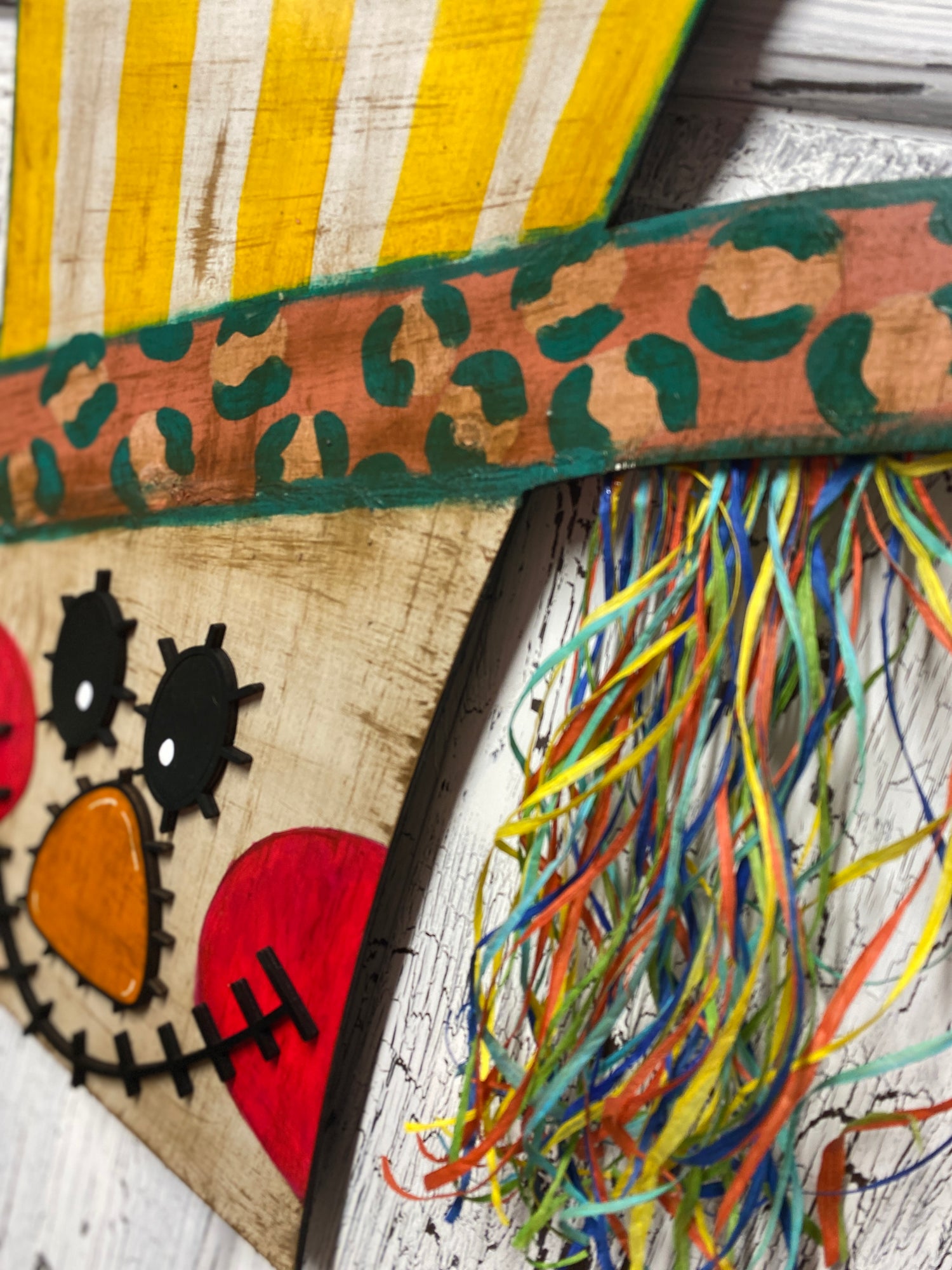 Bring warmth and whimsy to your home this autumn with this hand painted scarecrow door hanger. Crafted from quality birch wood, this rustic farmhouse wall hanging features bright, cheerful details including a yellow striped hat with a leopard print band, rosy cheeks, and colorful raffia hair. A beaded wire hanger makes it easy to display on your front door, porch, or inside your home.